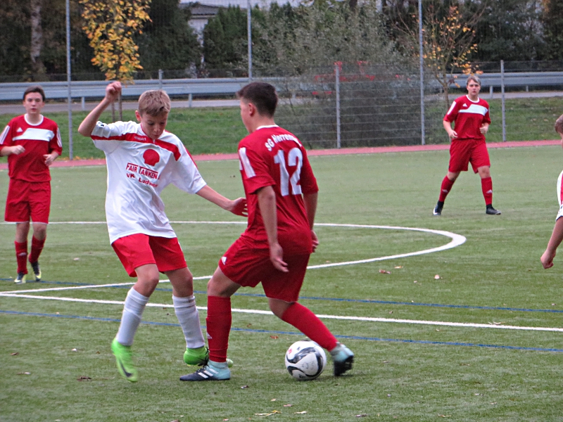 Die Hausherren bestimmten in den ersten 20 Minuten das Spielgeschehen. Sie erspielten sich einige gute Torchancen, die sie leichtfertig vergaben. Schon nach zwei Minuten lag der Ball bei uns im Netz. Die SG Sulzbachtal nutzte dabei die mangelnde Abstimmung zwischen Abwehrspieler Jannis und Torhüter Yannick, die sich gegenseitig behinderten. Zwei Minuten später hätten die Gastgeber gar auf 2:0 erhöhen können, nachdem Yannick ein Torschuss über die Arme an den Pfosten rutschte. Obwohl wir unsere Offensivbemühungen gegen die körperlich überlegene Heimelf auf lange Bälle und Konter beschränken mussten, kamen wir wiederholt zu guten Einschussmöglichkeiten. In der 6. Minute setzte Tim sich auf der rechten Außenbahn durch. Seine scharfe Hereingabe an den 5-Meter-Raum fand aber keinen Abnehmer. Nach gut einer Viertelstunde konnte Tim sich zunächst nicht gegen die weit aufgerückte Torhüterin der Gastgeber durchsetzen. Der Ball prallte zu Fabian, der von der Mittelinie zu überhastet abschloss und das Tor verfehlte. In der 21. Minute scheiterte Tim nach einerm langen erneut an der Torhüterin. Danach konnten wir das Spiel ausgeglichener gestalten. Zum Ausgleich verhalf uns ein Freistoß aus der eigenen Hälfte. Leon schlug diesen diagonal über den Platz auf die rechte Seite, wo Niklas B. den Ball von der Strafraumgrenze ins rechte Eck schoss. Alle hatten sich auf ein Remis zur Pause eingestellt. Aber zwei Minuten vor dem Halbzeitpfiff kam es erneut zu Abstimmungsschwierigkeiten in unserer Abwehr. Jaro berührte eine Flanke, die Yannick sicher gehalten hätte. Den frei liegenden Ball verwandelten die Gastgeber zum 2:1 Führungstreffer.