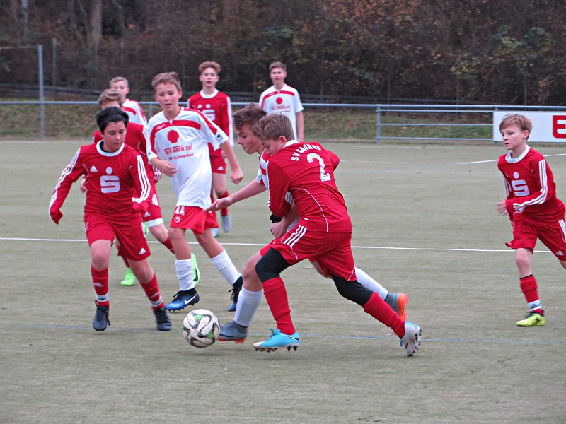 Die Hausherren bestimmten in den ersten 20 Minuten das Spielgeschehen. Sie erspielten sich einige gute Torchancen, die sie leichtfertig vergaben. Schon nach zwei Minuten lag der Ball bei uns im Netz. Die SG Sulzbachtal nutzte dabei die mangelnde Abstimmung zwischen Abwehrspieler Jannis und Torhüter Yannick, die sich gegenseitig behinderten. Zwei Minuten später hätten die Gastgeber gar auf 2:0 erhöhen können, nachdem Yannick ein Torschuss über die Arme an den Pfosten rutschte. Obwohl wir unsere Offensivbemühungen gegen die körperlich überlegene Heimelf auf lange Bälle und Konter beschränken mussten, kamen wir wiederholt zu guten Einschussmöglichkeiten. In der 6. Minute setzte Tim sich auf der rechten Außenbahn durch. Seine scharfe Hereingabe an den 5-Meter-Raum fand aber keinen Abnehmer. Nach gut einer Viertelstunde konnte Tim sich zunächst nicht gegen die weit aufgerückte Torhüterin der Gastgeber durchsetzen. Der Ball prallte zu Fabian, der von der Mittelinie zu überhastet abschloss und das Tor verfehlte. In der 21. Minute scheiterte Tim nach einerm langen erneut an der Torhüterin. Danach konnten wir das Spiel ausgeglichener gestalten. Zum Ausgleich verhalf uns ein Freistoß aus der eigenen Hälfte. Leon schlug diesen diagonal über den Platz auf die rechte Seite, wo Niklas B. den Ball von der Strafraumgrenze ins rechte Eck schoss. Alle hatten sich auf ein Remis zur Pause eingestellt. Aber zwei Minuten vor dem Halbzeitpfiff kam es erneut zu Abstimmungsschwierigkeiten in unserer Abwehr. Jaro berührte eine Flanke, die Yannick sicher gehalten hätte. Den frei liegenden Ball verwandelten die Gastgeber zum 2:1 Führungstreffer.
