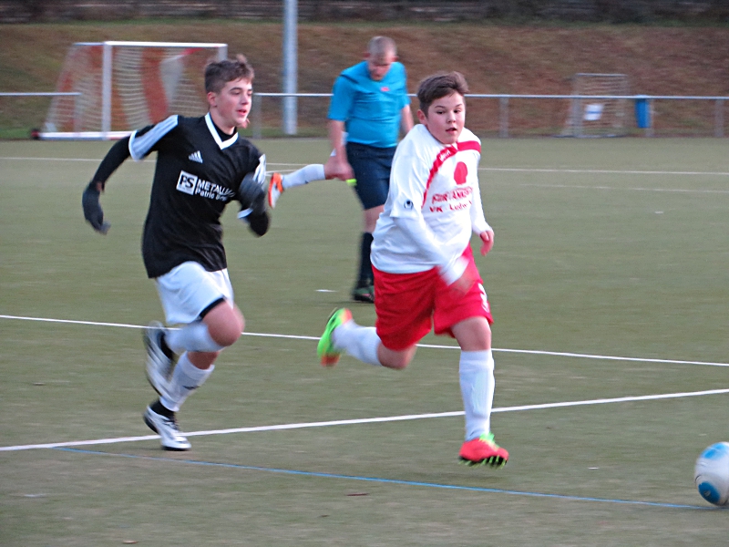 Nach der Pause war unser Pass- und Stellungsspiel erheblich verbessert. Nach einer Ecke in der 49. Minute konnte Leon aus wenigen Metern völlig frei stehend den Ball nicht im Tor unterbringen. In unsere Drangphase setzte Saar 05 in der 51. und 55. Minute zwei Konter und zog auf 3:0 davon. Dennoch gab unsere Mannschaft nicht auf. Alex erzielte in der 62. Minute mit einer Flanke den Anschlusstreffer. Tim verkürzte drei Minuten vor Schluss sogar auf 2:3. Der Ausgleich gelang uns jedoch nicht mehr.