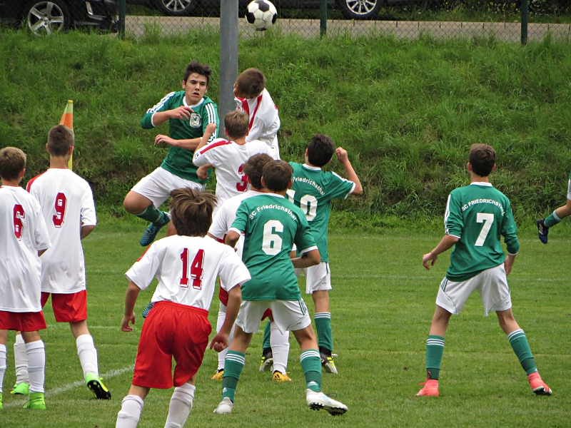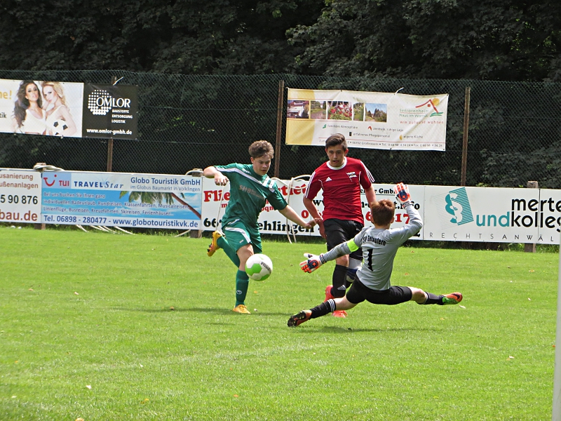 Wir kamen gut in die Partie. Fabian hatte nach wenigen Minuten eine große Chance unser Team in Führung zu bringen. Aus spitzem Winkel scheiterte er jedoch am Torwart. Quasi im Gegenzug trafen die Gäste nach einem schönen Pass in die Tiefe zum 0:1. Im weiteren Verlauf übernahm Saar 05 die Spielregie. Das Geschehen spielte sich aber überwiegend zwischen den Strafräumen ab. Gegen Ende der Begegnung waren wir konditionell überlegen. Wir setzten die Gäste unter Druck. Zunächst hatte Julian eine hundertprozentige Torchance, die noch pariert werden konnte. Die anschließende Ecke servierte er auf den kurzen Pfosten zu Dorian, der mit einem wuchtigen Kopfball die Kugel in den Winkel hämmerte.
