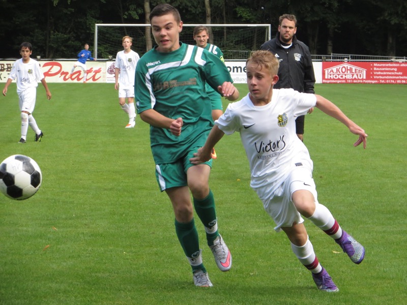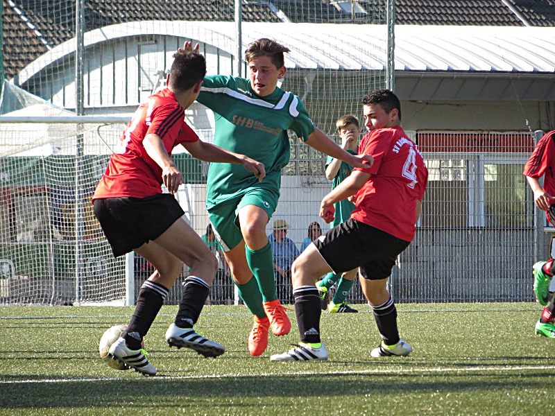 20160910 c svr voelklingen 2 sg scg 45Die erste Halbzeit war im Wesentlichen von Mittelfeldaktionen geprägt. Es wurden auf beiden Seiten kaum Torchancen herausgespielt. Wir fanden zunächst überhaupt nicht ins Spiel, Völklingen hatte mehr Spielanteile. In den Zweikämpfen zu weit weg vom Gegner spielten wir in der Vorwärtsbewegung einen Fehlpass nach dem anderen oder verloren den Ball in Einzelaktionen. Völklingen war von Beginn an aggressiver und gewann die Mehrzahl der Zweikämpfe. Bereits nach fünf Minuten brachten sie ihren Stürmer mit einem in die Spitze gespielten Ball in Position und trafen zum 1:0. Die beste Szene einer schwachen ersten Hälfte hatte Lucas in der 35. Minute, als er frei vor dem Torhüter aus 10 Meter den Ball über das Tor schoss.
