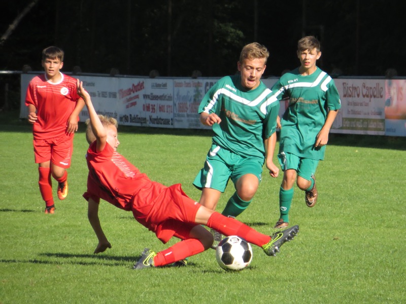 Das Spiel hätte aber auch anders laufen können. Der kleinste Spieler stand bei uns heute im Tor. Yannick Thieser, der zuvor noch bei den D-Junioren gespielt hatte und den abwesenden Stammkeeper Kilian ersetzte, musste sich in der 1. Minute ganz lang machen, um einen Schuss von Rastpfuhl mit einem mächtigen Hechtsprung von der Linie zu kratzen. Das war wohl der Weckruf für den Rest des Teams und das einzige Mal, dass Rastpfuhl überhaupt vor unserem Tor auftauchte. Nach 7 Minuten verwandelte Yannick Faber von der halblinken Seite einen Freistoß direkt ins lange Eck. Romain traf 10 Minuten später nach Vorlage von Meik zum 2:0 und erhöhte fünf Minuten später auf 3:0. Eine Ecke von Yannick Faber drückte Rafael über die Linie. Der Ball wäre aber vermutlich ohnehin auch so ins Tor gegangen. Mit den vier Gegentreffern war die Heimelf noch gut bedient.