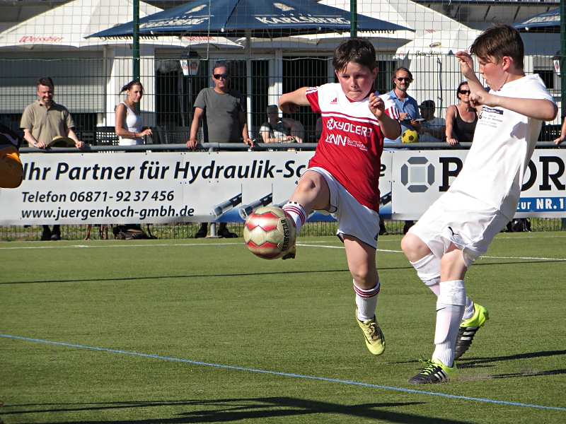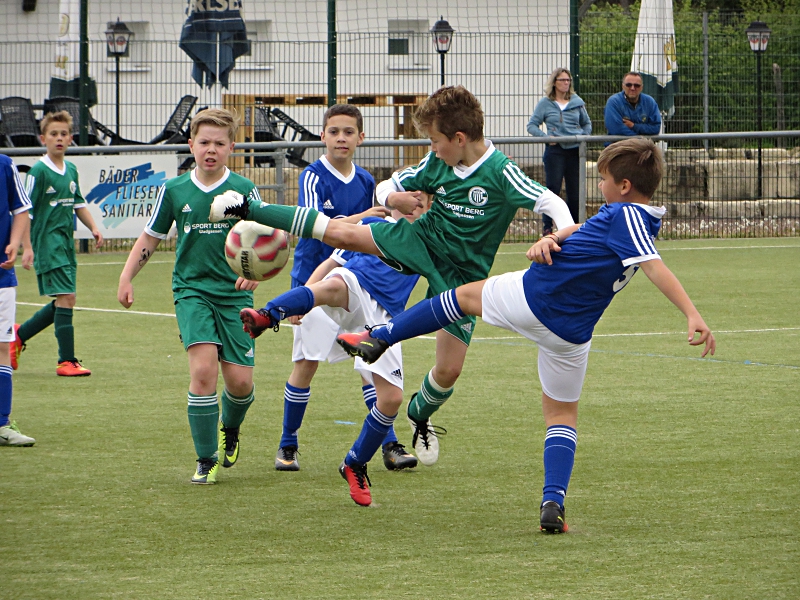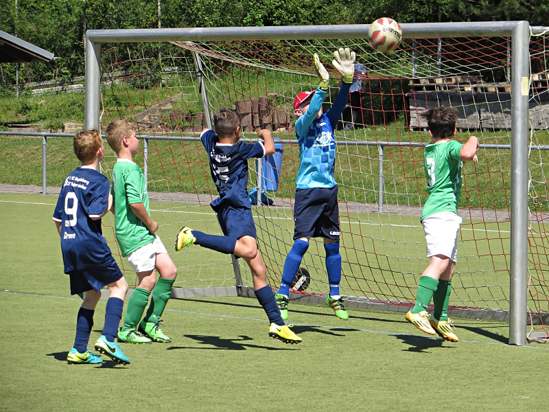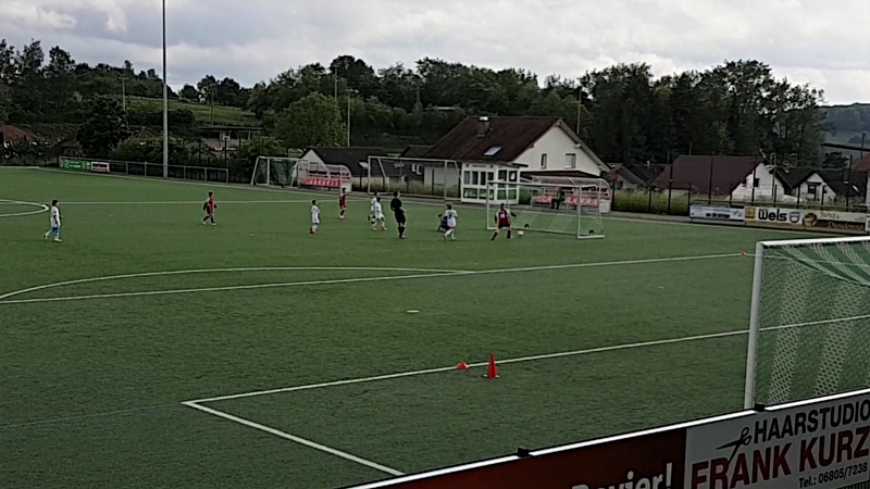 In der 35. Minute folgte dann noch das 0:4. Jetzt fingen unsere Jungs auch mal an, etwas Fussball zu spielen. 37.Minute: Elias H. spielte den Ball von links in die Mitte, aber der Torwart war zur Stelle. 39. Minute: Schön getretener Eckball unserer Jungs. Die Direktabnahme war allerdings zu schwach und auch zentral auf den Torwart gezielt, so dass dieser ohne Probleme halten konnte. In dieser kurzen Drangphase fiel dann das 0:5 durch einen direkten Freistoss.