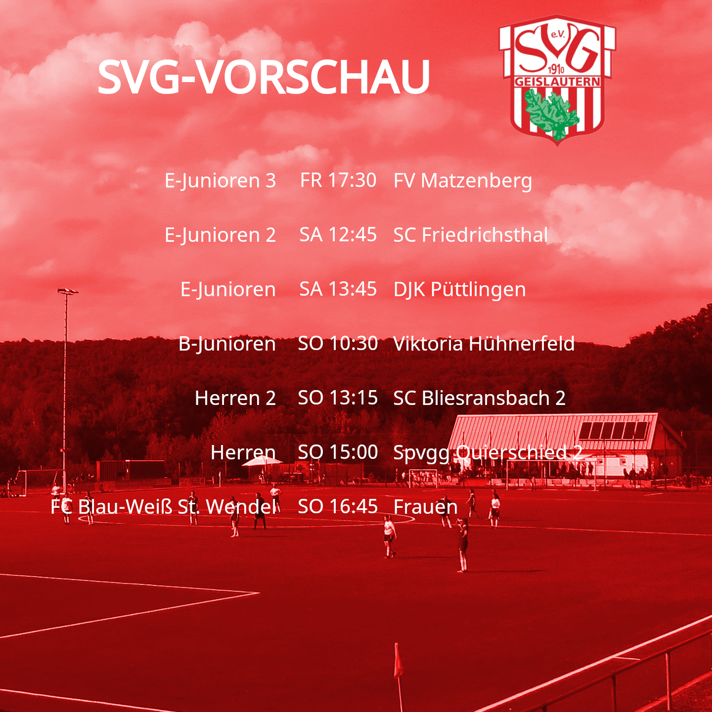Daneben spielen die G-Junioren am Samstag ab 10:15 Uhr in Köllerbach sowie die F-Junioren ab 13:15 Uhr in Walpershofen.